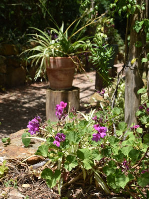At the far end of the garden is a delightful, tree-shaded café, which serves a fully organic menu. The terrace wall of the café is clad in climbing aloe (Aloiampelos ciliaris), beyond which the garden drops away to the seashore. The view is truly sublime.