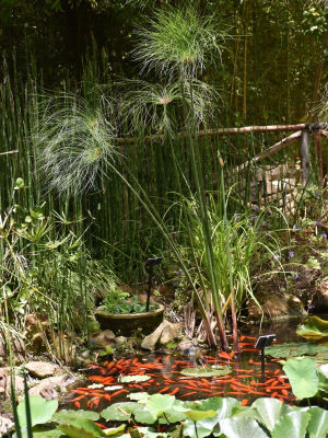 The first garden, on the right, is a contemplative Chinese Garden accessed through a circular, stone-built portal known as a Moon Gate. Lush with bamboo and ferns, it includes a tranquil lily pond in which goldfish find shade beneath papyrus fronds and a rustic bridge.