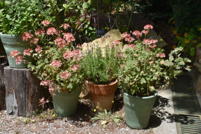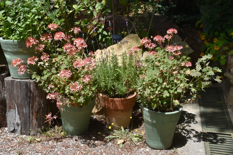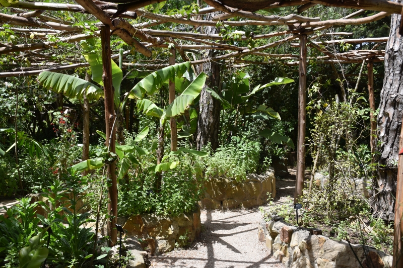 Beyond is the Moroccan Garden, containing a wide variety of medicinal and culinary herbs long used by Moroccans in their cuisine and herbal remedies. They include oregano (Origanum vulgare), wormwood (Artemisia absinthium), fringed rue (Ruta chalepensis), turmeric (Curcuma longa) and lemon verbena (Aloysia citrodora), as well as winter savory (Satureja montana), green lavender cotton (Santolina virens), sage (Salvia officinalis) and scented geranium (Pelargonium graveolens).