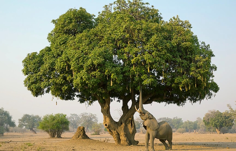 - Baobab (Adansonia digitata). An iconic tree whose massive trunk stores water, while its pendulous white blossoms release a subtle fragrance at dusk. The tart, powdery pulp of its fruit is highly nutritious. I tried it at a local market with plenty of sugar and dazzlingly coloured. The tree’s leafless winter silhouette can appear stark. According to legend, the devil uprooted it and shoved it back into the ground upside down, revealing its tangled roots.