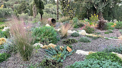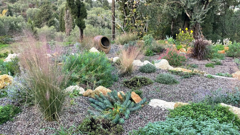 Looking forward to longer, lighter and, hopefully, drier days, Gail Lansdown has very kindly invited us to visit her garden near Kavvadades in the North West of Corfu starting at 11am. Gail’s garden was designed a few years ago but, like many a garden, the original design evolved over time to be something quite different than the original idea. It was planted over a number of months a little less than a year ago. The main feature of the area is a gravel garden which is surrounded by much other planting.