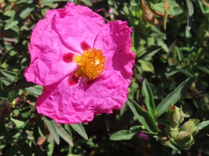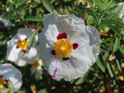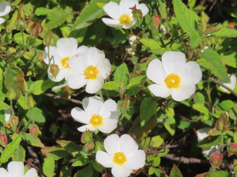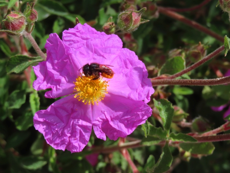 The bees adore the various cistuses that we started planting ten years ago and have continued to propagate: the deep pink Cistus × purpureus with its dark patches towards the yellow centre; the grey-leaved C. albidus with its pink flowers and yellow centre; the paler pink C. crispus; the spectacular C. ladanifer, white with its brown patches towards the yellow centre; and the pure white C. salviifolius with a pale yellow centre. All these appear to thrive in the unforgiving conditions of our Sicily garden and are at their most vibrant at this time of the year. I have been very surprised not to see more cistuses grown in our region. They need so little care and we never water them except during their first year of planting.