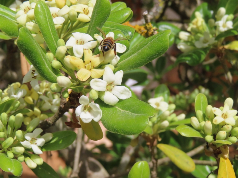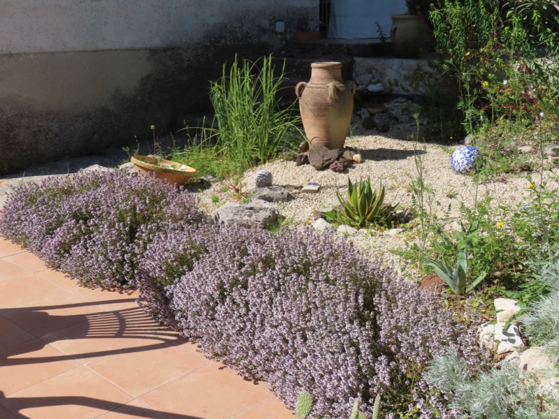 The bees are also very fond of our rather mature tree-sized Pittosporum tobira (Japanese mock orange) that fill the garden with their sweet fragrance in May and June. The Thymus vulgaris that we planted on the edge of our small section of gravel garden is also constantly abuzz with the sound of bees at this time of the year, as well as attracting wall brown butterflies (Lasiommata megera). We sit and watch and listen, absorbed and amazed.