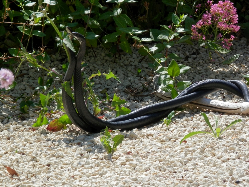 Lizards were scurrying about between the stones and low-growing vegetation. A family of buzzards could be seen on a clear day soaring above the woods at the back of the house. The stunning nine-spotted moths Amata phegea (formerly Syntonis phegea) were out in force, seeming particularly to enjoy settling on the wild carrot and scabious flowers. Damselflies and dragonflies darted about over the small pool. We even had the occasional visit from a handsome, rather brazen fox, which we later discovered was being fed by some builders working on a nearby house. A few years ago during our May visit we had our own private showing by two rather large snake-like creatures, which I believe may have been three-toed skinks (Chalcides chalcides); they performed a mesmerising courtship ritual just a few metres from where we were sitting, entwining themselves around each other, oblivious to us. We have not seen them since, but who knows what surprises may await us as we continue to grapple with our much-loved garden*.
