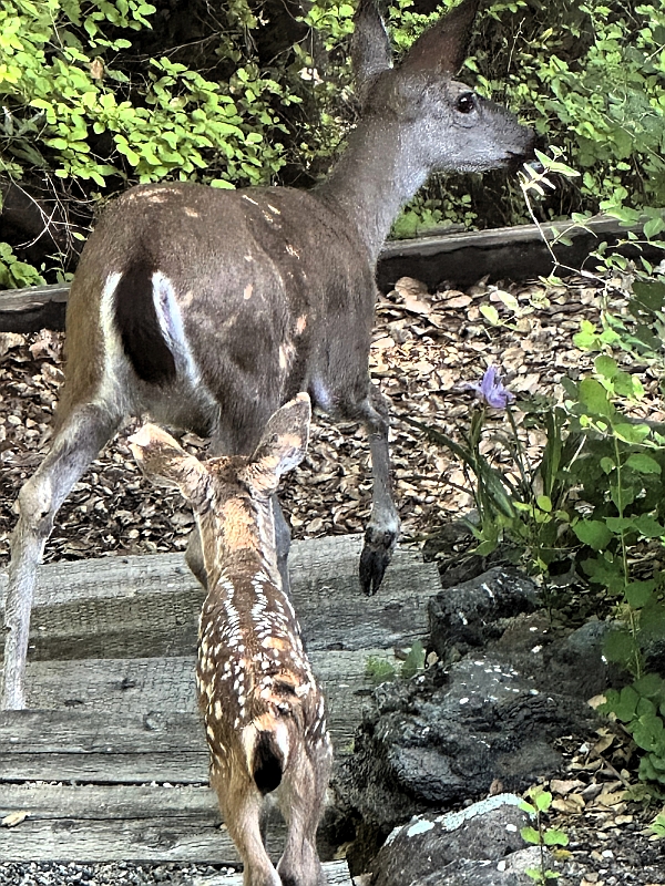 Doe and fawn walking through Katherine’s garden