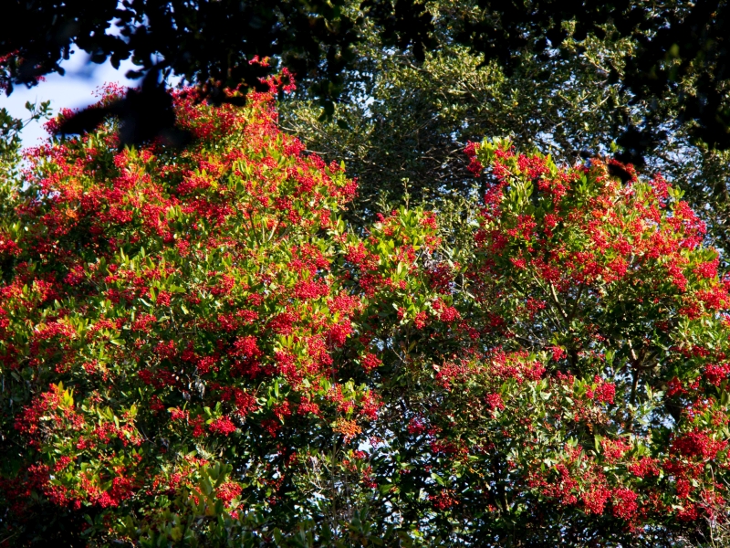 Toyon, Heteromeles arbutifolia (syn. Photinia arbutifolia), is a large evergreen shrub that produces clusters of brilliant red berries in autumn and winter. This is the plant that gave Hollywood its name, and it grows throughout California’s canyons and foothills. I planted several toyons in my hillside garden over forty years ago, and a few have grown from seeds dropped by birds. The edible berries are favoured by birds and were also eaten by Indigenous people, after cooking to remove their bitter taste. This long-lived shrub may be trained against a sunny wall or pruned into a small tree by removing the lower limbs.