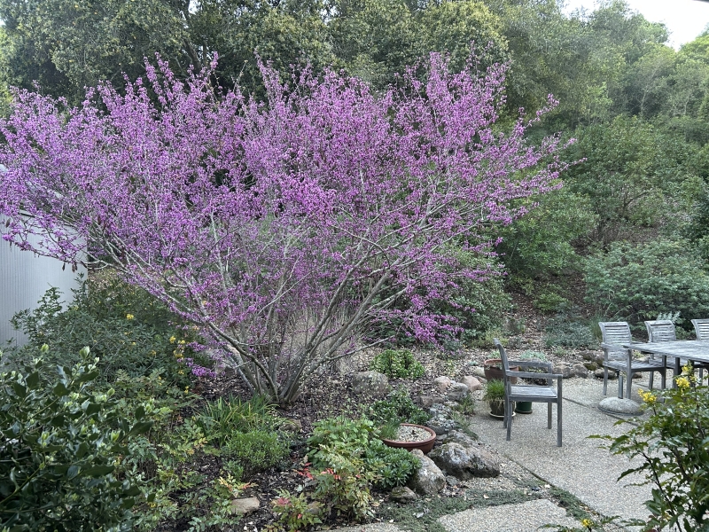 Western redbud (Cercis occidentalis) is a large deciduous shrub that can also be used as a small, multi-trunked tree. Native to dry slopes in California’s foothills, this shrub was coppiced by Indigenous people to produce new stems for basketry. I planted several western redbuds in my garden for year-round enjoyment, from the masses of pink flowers that emerge from bare branches in February to the heart-shaped leaves that turn a soft shade of yellow in autumn, and the zig-zag branches and seed pods in winter.