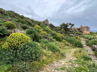 (Photo of mounds of yellow Euphorbia dendroides lighting up a path in the overcast landscape of Monemvasia’s Upper Town by Richard G. Turner)
