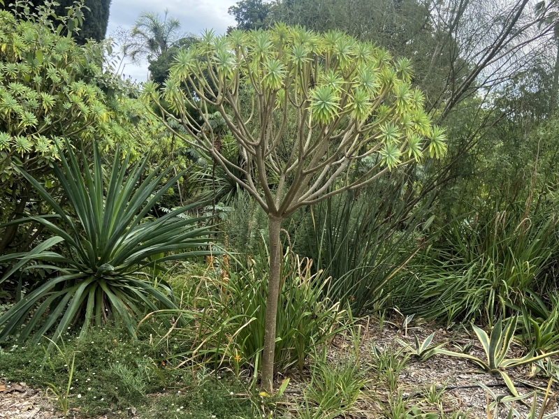 Extending the aloe theme: a fan aloe was backed by a tapestry of contrasting foliages. Formerly Aloe plicatilis it has been reclassified as Kumara plicatilis. Extending the aloe theme was this climbing form, now Aloiampelos ciliaris, scrambling through the massed succulents and right up the tree trunk.