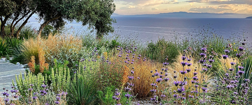 The photo at the top of this page shows Janet Ibbotson’s garden on Skopelos: Salvia clevelandii ‘Allen Chickering’ in full flower with Nasella tenuissima,