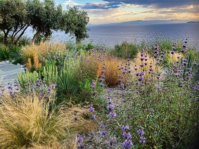 Creating combined Greek island living spaces/gardens in a steep, rocky, sloping olive grove, just above the sea and with a westerly aspect, was guaranteed to present challenges and an equally steep learning curve. Janet Ibbotson has designed a water-wise garden taking advantage of the existing olive trees and the stunning view towards the sea, which already less than two years later is thriving and abundant, in harmony with its surroundings . Read her superbly illustrated article in TMG 122.