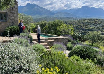 Katerina Giorgi found an old stone house and created her garden there 200m above sea level, with wonderful views of the Taygetos mountain range to the east, and the bay of Messinia to the west. Katerina’s well thought-out landscape design in summary: the hardscape and plantings are relatively formal near the house and become less so as the garden merges into the surrounding terrain; key plants are repeated to create a feeling of harmony; a serene colour palette favours drought-tolerant Mediterranean plants with leaves of subtle greens and greys; and the garden’s layout makes excellent use of the spectacular borrowed views. Read her illustrated article in TMG 117.and a report on our visit during the 2025 AGM TMG 121.